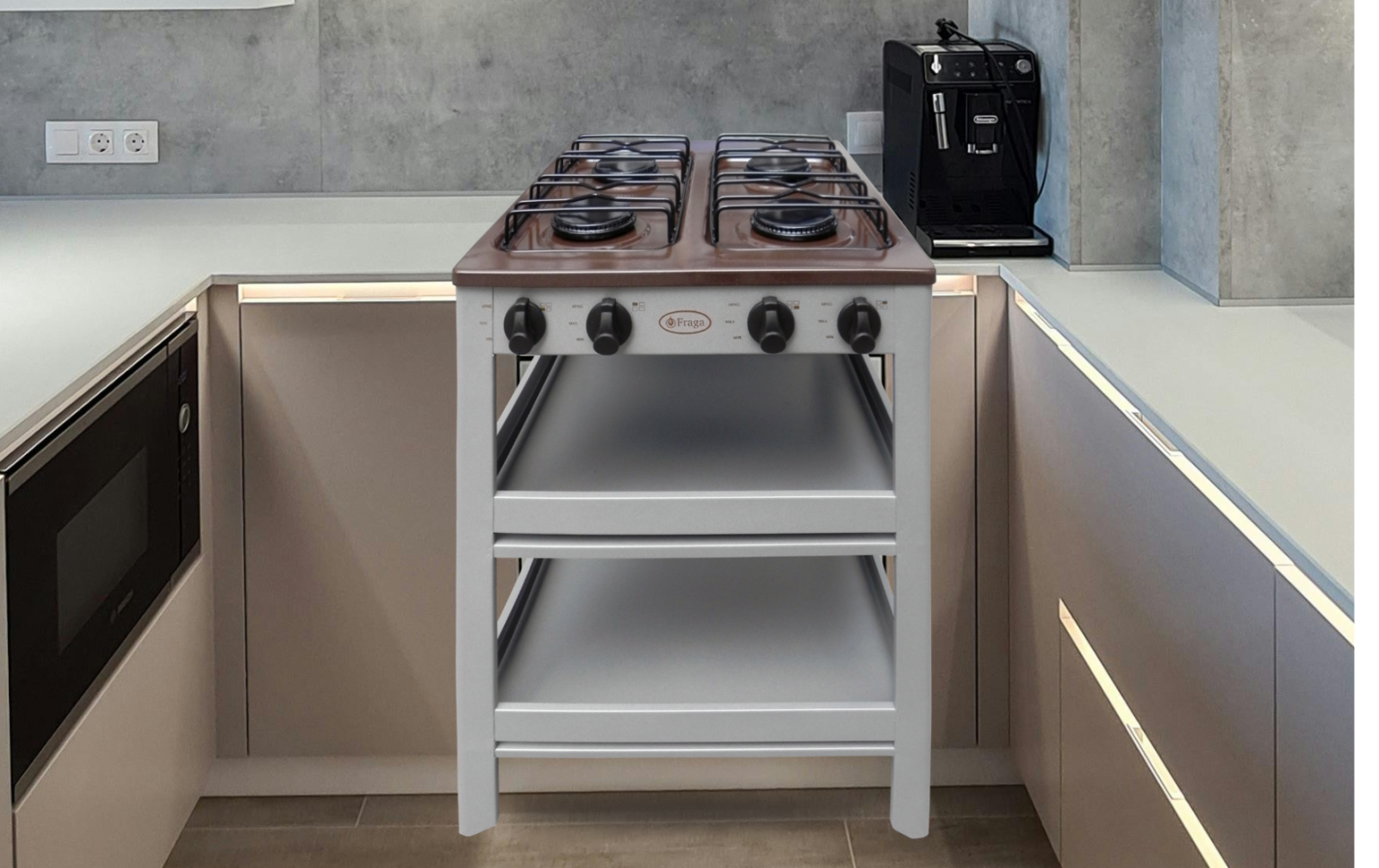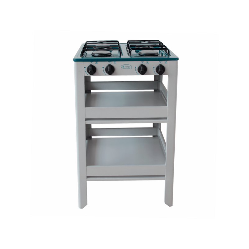 La FRAGA P910 es una parrilla de anaquel (de piso con estante abierto) que ofrece una amplia capacidad de cocción con sus 4 quemadores a gas. Su estructura se eleva sobre el suelo a una altura cómoda de 80 cm (ideal para cocineros), e incorpora un espacio de almacenamiento inferior abierto recubierto con pintura electrostática. Este diseño la convierte en una solución robusta y funcional, a menudo utilizada en cocinas domésticas que requieren una gran superficie de cocción sin la complejidad de un horno.