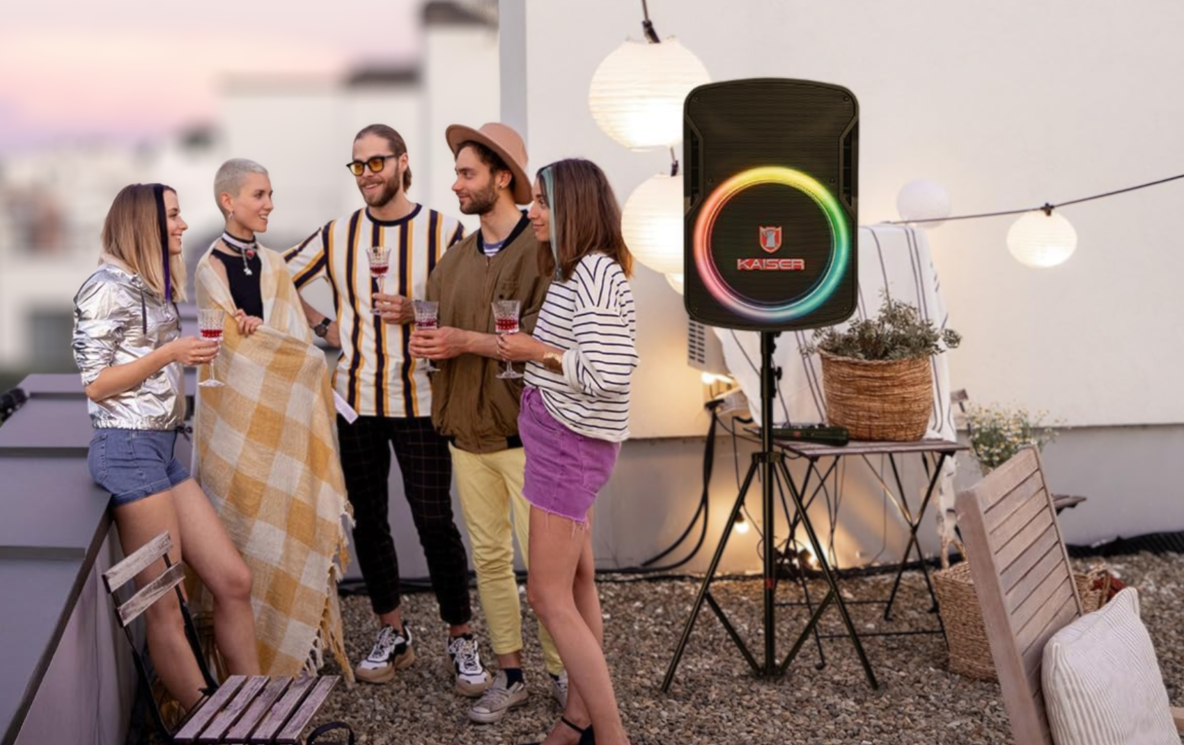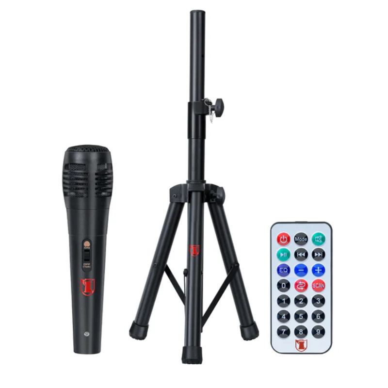 El equipo está diseñado para presentaciones en vivo y karaoke, ya que incluye un micrófono alámbrico y un tripié como accesorios, además de entradas dedicadas para micrófono y guitarra.