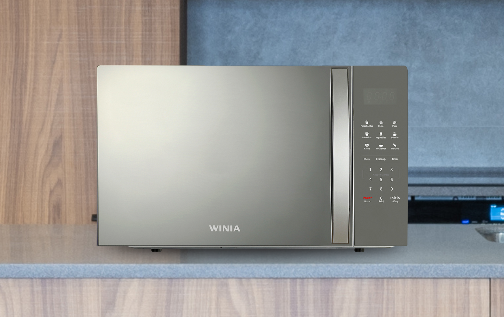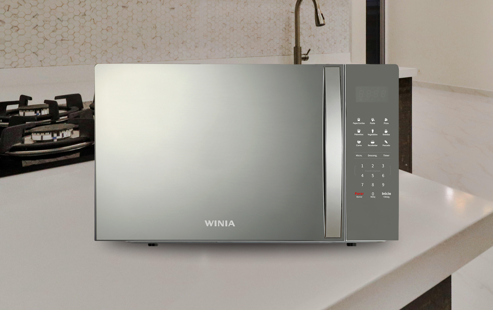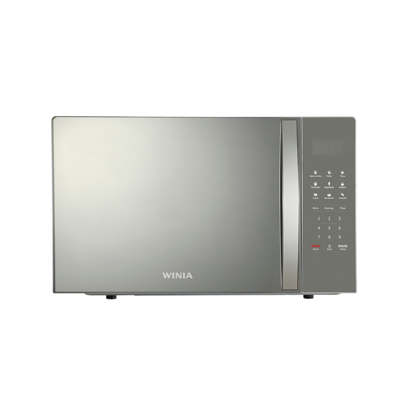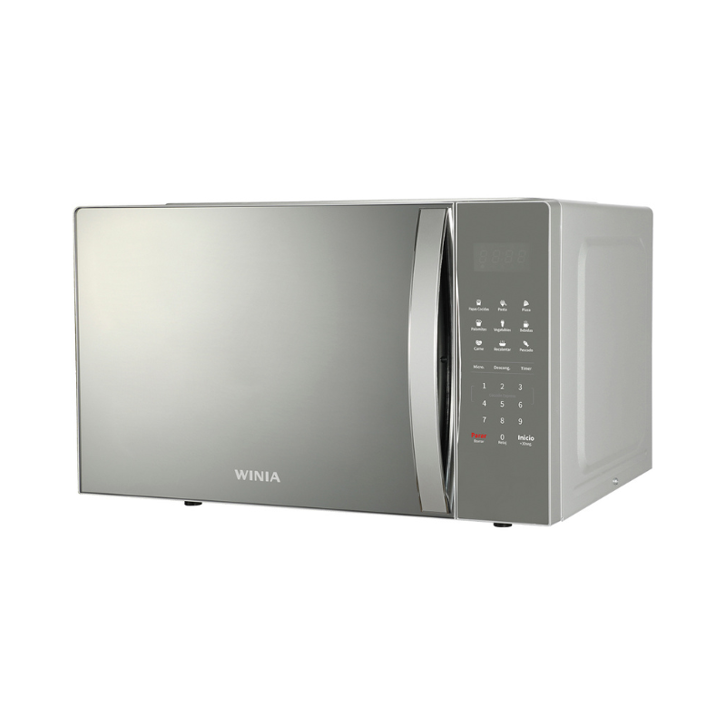 El microondas Winia KOS-1N5HSSA es un electrodoméstico de gran capacidad de sobremesa, con un volumen interior de 1.5 pies cúbicos (aproximadamente 42.5 litros), ideal para familias grandes o para cocinar porciones considerables. Combina funcionalidad con un diseño moderno, destacando su puerta de cristal con acabado espejo y su panel de control digital con pantalla LED, lo que facilita su integración en cualquier cocina contemporánea.