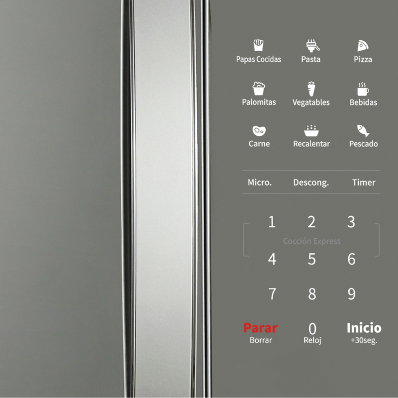 El microondas está equipado con múltiples funciones de conveniencia diseñadas para simplificar la preparación de alimentos. Incluye 8 menús automáticos preestablecidos para platillos comunes (como papas, pizza, palomitas, etc.) y una función de descongelado automático por peso y tiempo, lo que elimina las conjeturas al procesar ingredientes. Además, incorpora un temporizador de hasta 99 minutos y un bloqueo de seguridad para niños.