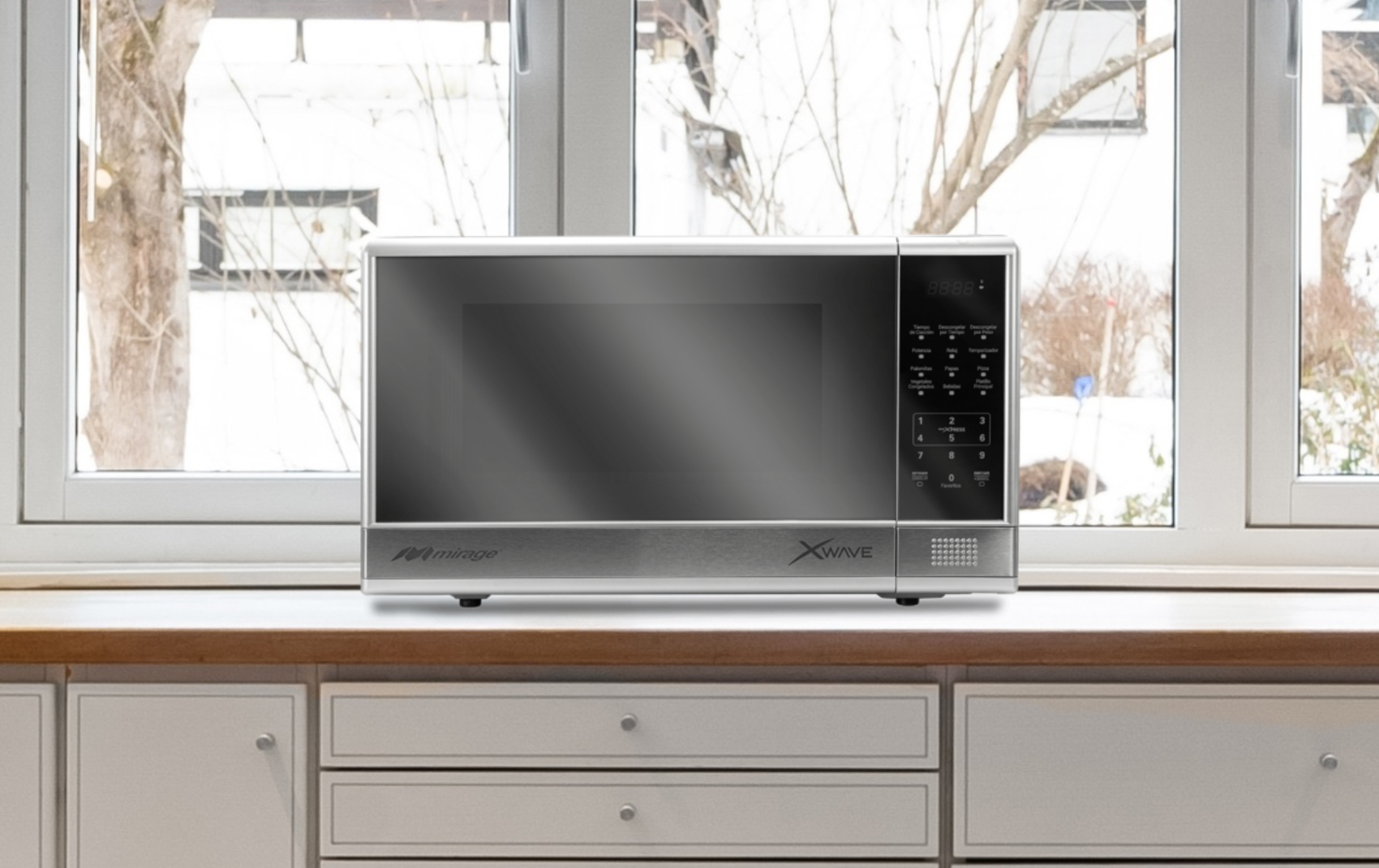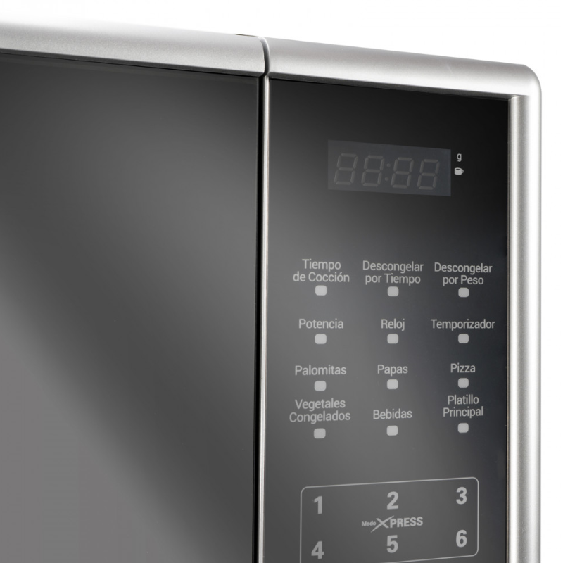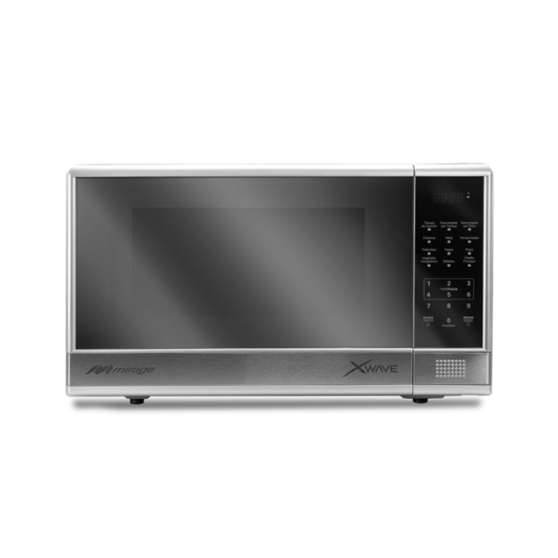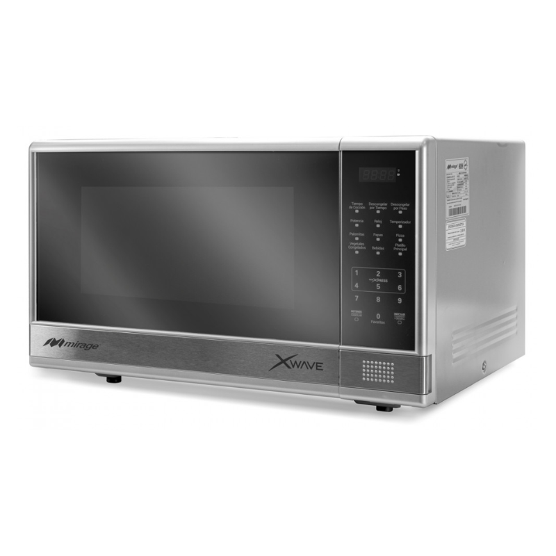 El microondas Mirage MWD031E es un electrodoméstico con una capacidad generosa de 1.1 pies cúbicos (aproximadamente 31 litros) y una potencia de salida de 1000 watts. Este modelo combina un alto rendimiento con un diseño sofisticado, gracias a su acabado tipo espejo en color plata. Es una opción eficiente para el hogar, que permite calentar, cocinar y descongelar rápidamente con un panel de control digital de membrana táctil.