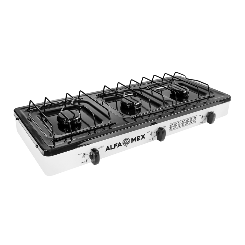 La parrilla de sobremesa ALFAMEX modelo 611 es una estufa de gas LP de tamaño intermedio equipada con tres quemadores, lo que permite una capacidad de cocción versátil, ideal para familias pequeñas o medianas. Se utiliza colocándola directamente sobre la encimera.