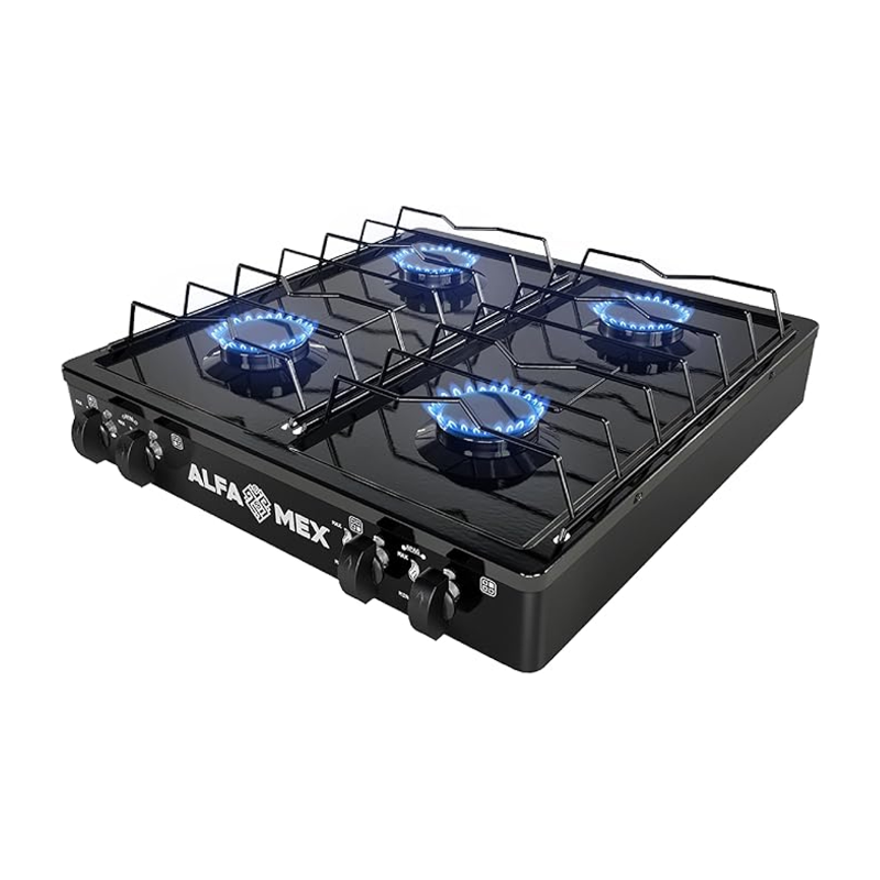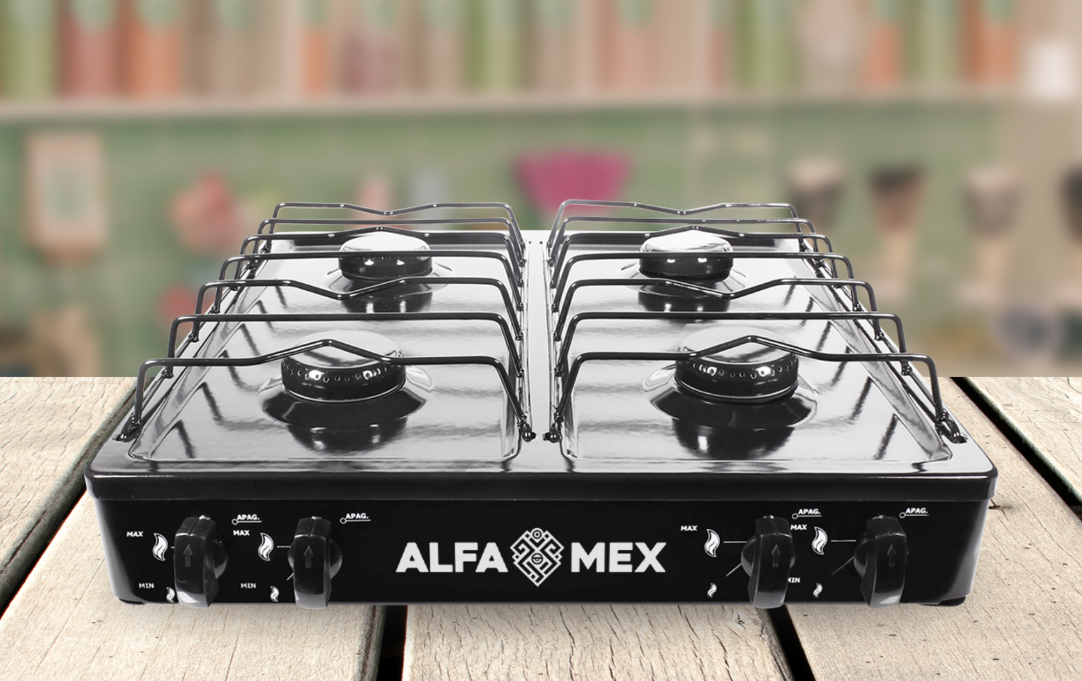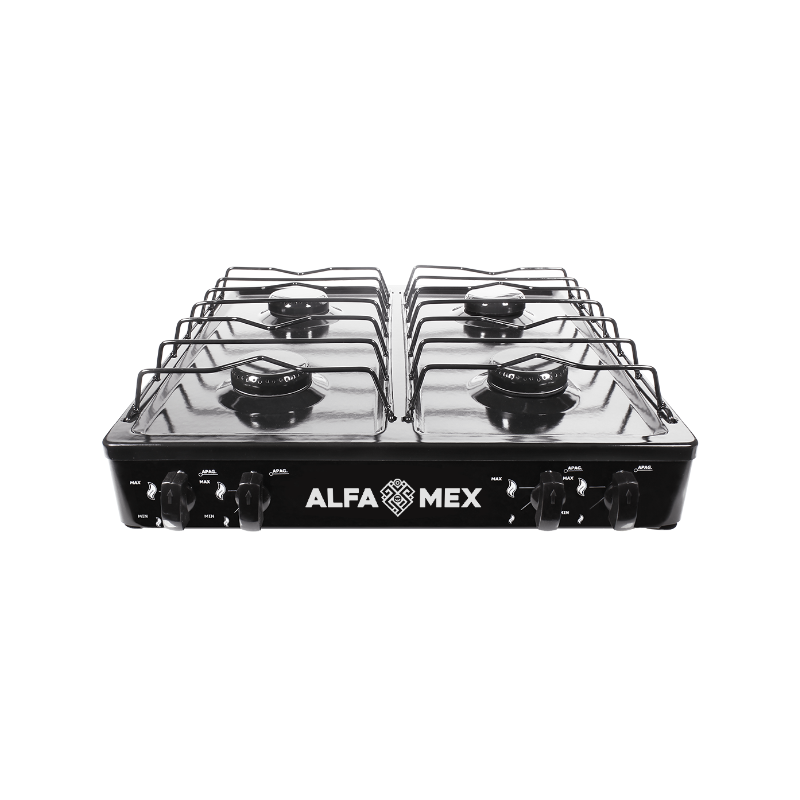 La parrilla de sobremesa ALFAMEX modelo 311 es una estufa de gas LP funcional y de tamaño familiar, equipada con cuatro quemadores que permiten la preparación simultánea de múltiples platillos. Está diseñada para colocarse directamente sobre cualquier superficie de cocina o departamento.